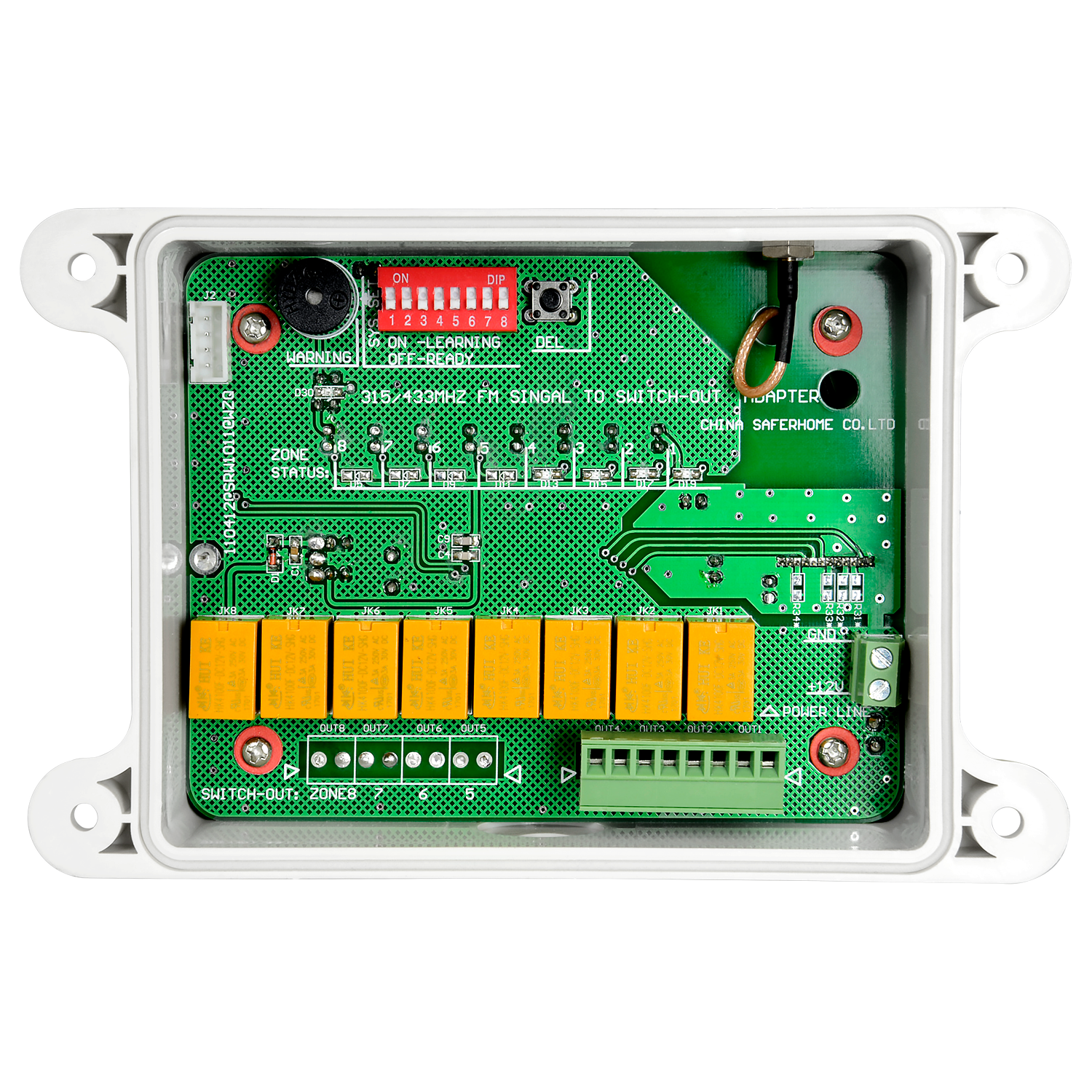 Receptor de barreras solares infrarrojas – 4 entradas inalámbricas – 4 salidas cableadas – Hasta 6 dispositivos por entrada – Dip Switch de configuración